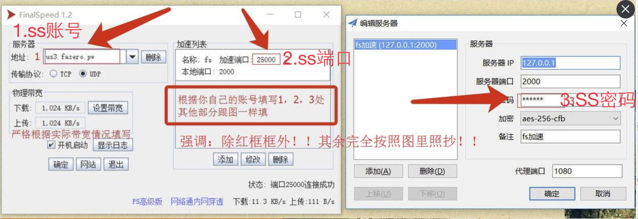注意ss客户端的服务器IP必须为127.0.0.1 finalspeed客户端的地址填你的ss服务器IP. 左边的本地端口填2000,对应右边的服务器端口也填2000。
